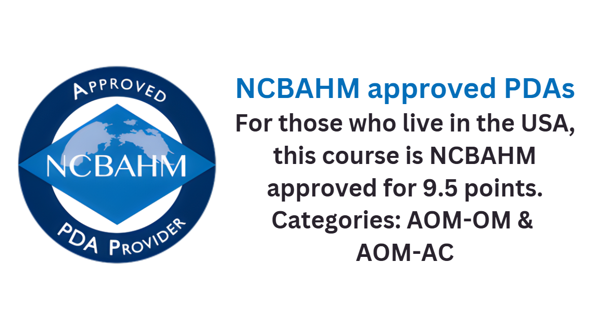🌎 USA – NCBAHM: 9.5 PDAs – only the THEORY part of this course is approved (the NCBAHM does not approve recorded videos with needling demonstrations)